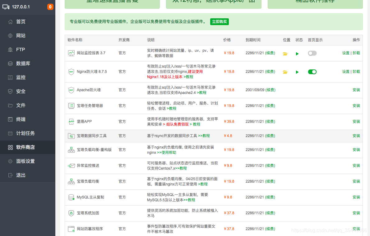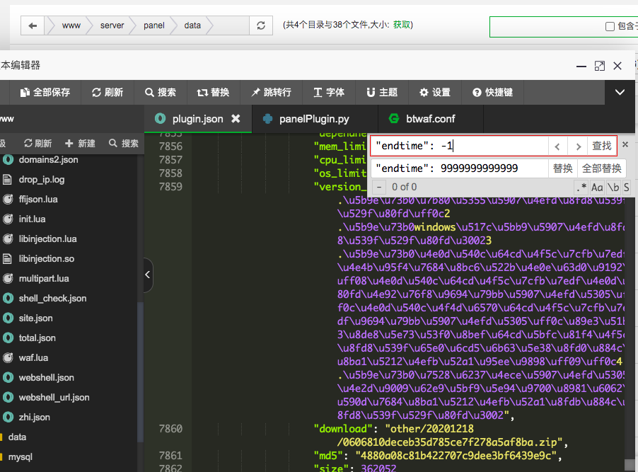 2.找到文件/www/server/panel/data/plugin.json 批量替换 "endtime": -1为"endtime": 9999999999999